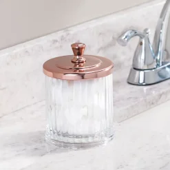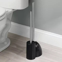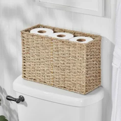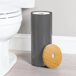 MDesign Free Standing Toilet Paper Holder, Wood Lid – White/Natural