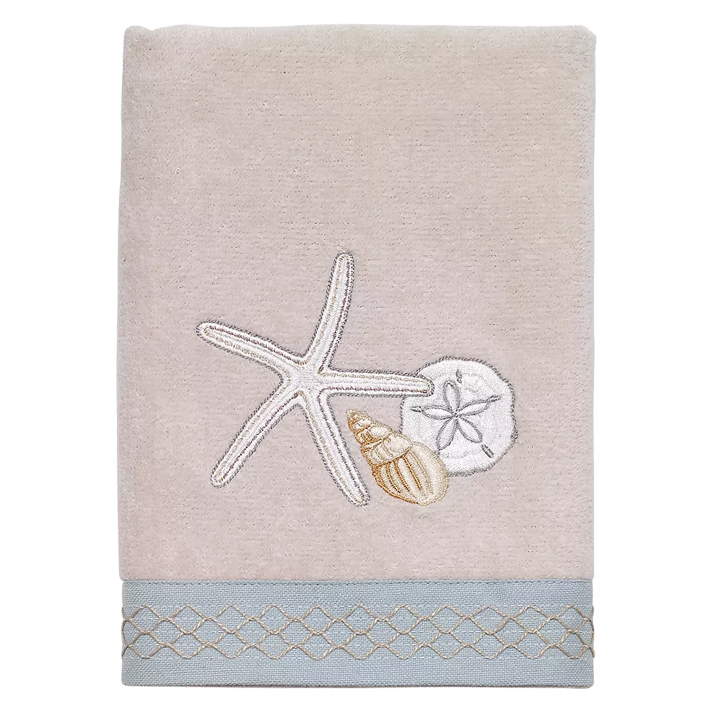 - Embroidered shells, Lattice embroidered hem, Sheared velour towel