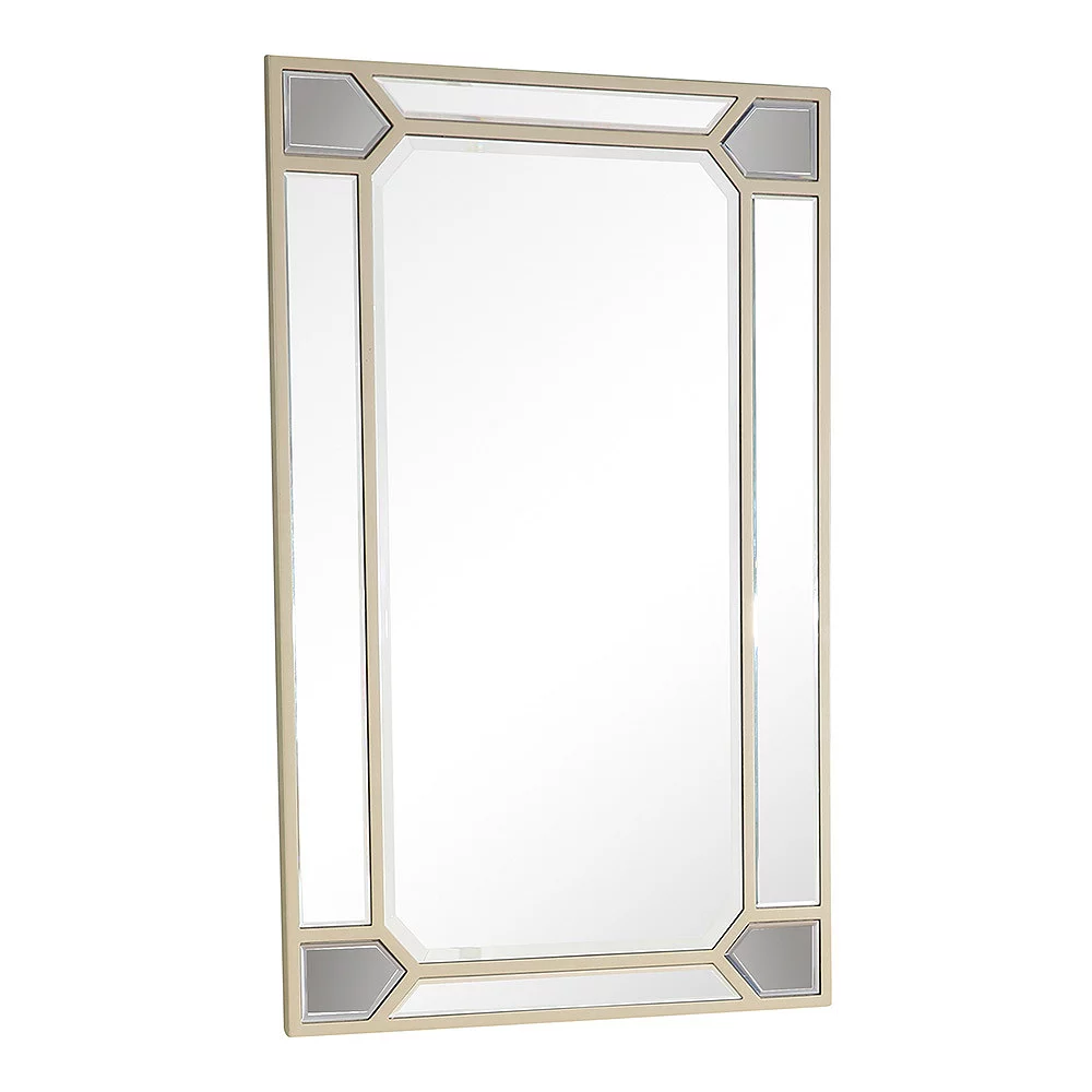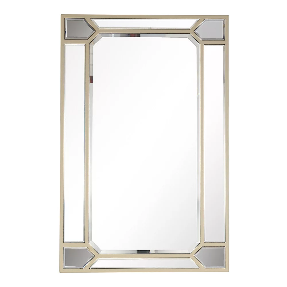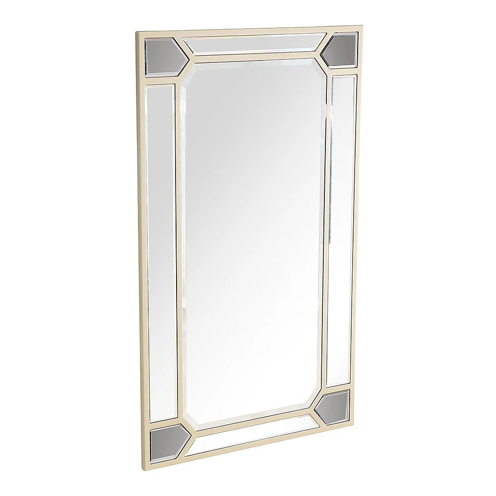 The Keeley Beveled Accent Mirror is the true definition of elegance with a simple yet eye-catching design and neutral tones. Its exquisitely crafted gray and white edges with unique geometric shapes make it a ravishing addition to a modern bathroom or traditional bedroom. This versatile mirror blends artistically with both vibrant and pastel color pallets and adds a new dimension to any room. Beveled 28.4 x 42.6 mirror has a high quality silver backing. Ready to hang either vertically or horizontally with pre-attached hanging mounts. Antiqued silver finish frame. Geometric mirrored corners. Ready to hang either direction with preattached rings. Overall dimensions: 28.4 x 42.6 inches. Beveled glass edges have been cut at an angle to create a framed look and add dimension. This mirror is sure to be the focal point of the room. Surface Shape: Flat. Purposeful Distressing Type: No Distressing. Mirror Height – Top to Bottom: 35.9. Mirror Width – Side to Side: 18.4. Largest Dimension: 42.6. Trend: Casual. Size: Large (3O-in to under 5O-in H). Edge Type: Beveled. Mounting Bracket Included: Yes. Mounting Hardware Included: No. Tilting: No. Shelf Included: No. Wood Species: Pine.