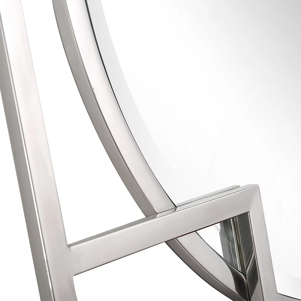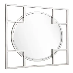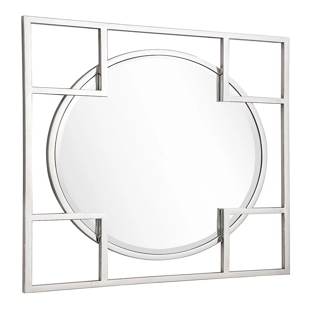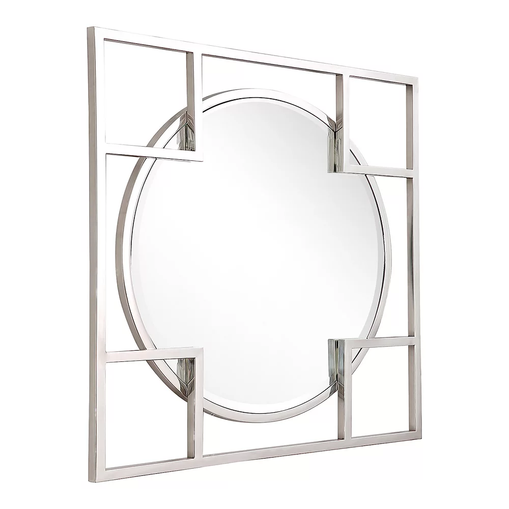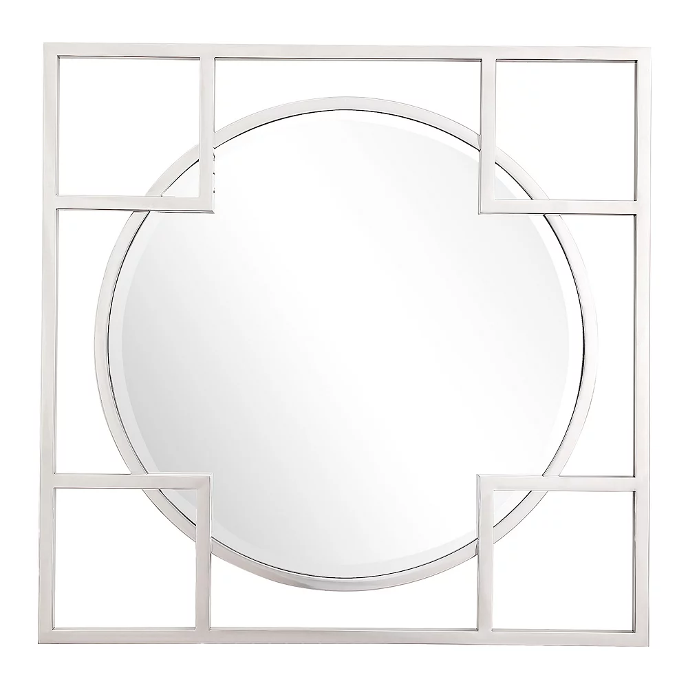 If you want to make a statement with a simple look, the Kinney Square Accent Mirror is perfect for you. The square geometric shapes on the borders overlap the circular beveled mirror to create a unique look that complements your modern or rustic chic interior design. This mirror looks stylish on any background!Beveled 33 x 33 mirror has a high quality silver backing. Ready to hang either vertically or horizontally with pre-attached hanging mounts. Stainless steel frame. Raised frame sits in front of mirror creating depth. Ready to hang either direction with preattached rings. Overall dimensions: 33 x 33 inches. Beveled glass edges have been cut at an angle to create a framed look and add dimension. This mirror is sure to be the focal point of the room. Surface Shape: Flat. Purposeful Distressing Type: No Distressing. Mirror Height – Top to Bottom: 26. Mirror Width – Side to Side: 26. Largest Dimension: 33. Trend: Casual. Size: Large (3O-in to under 5O-in H). Edge Type: Beveled. Mounting Bracket Included: Yes. Mounting Hardware Included: No. Tilting: No. Shelf Included: No.