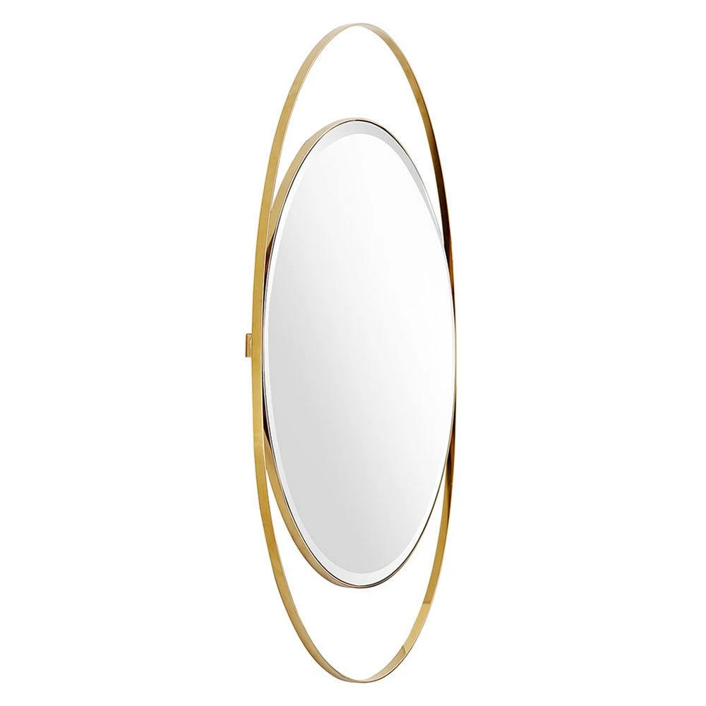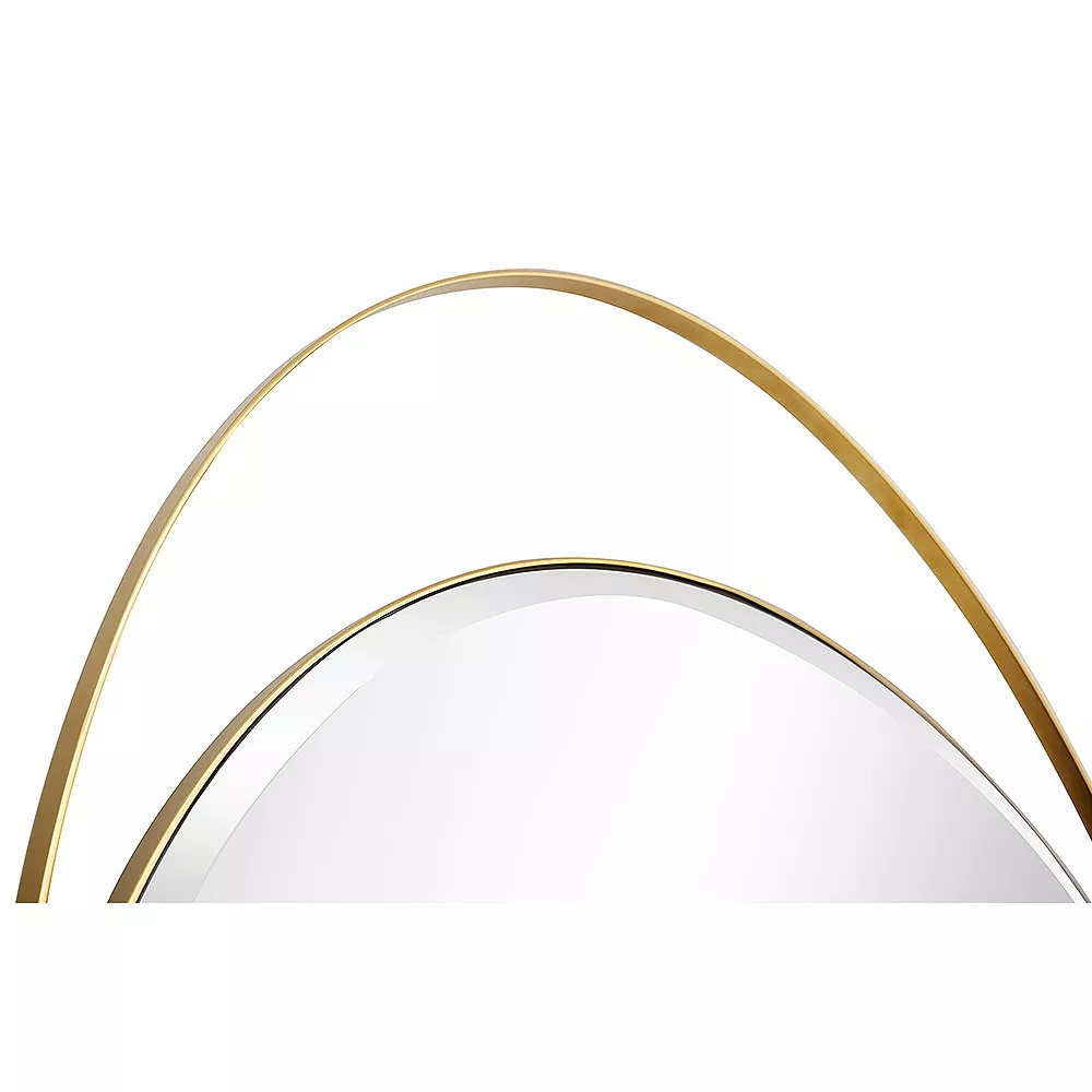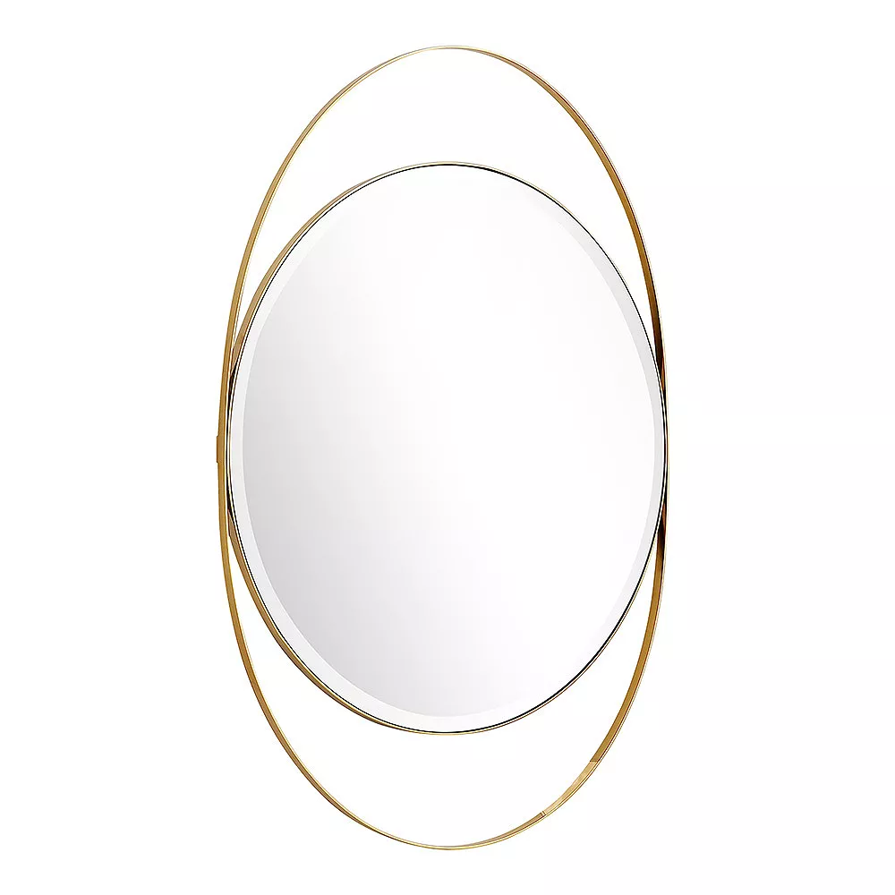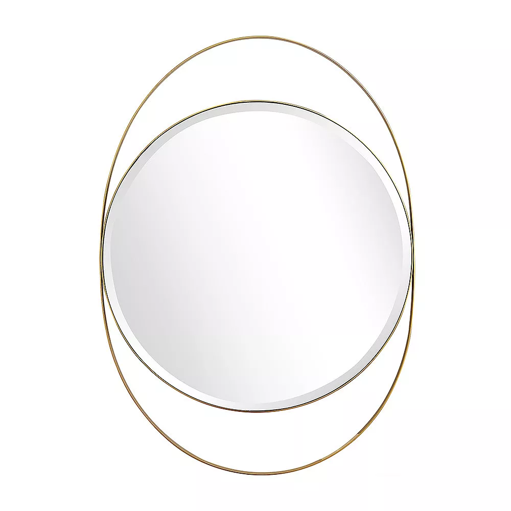 The Sonya Accent Mirror adds a unique style to your bedroom, foyer, or any living space. It features a thin oval frame and flaunts another gold frame around the beveled edge for a stylish appearance. This mirror looks gorgeous on a warm gray or pastel pink wall. Or use it on a bold background to create a glamorous look. Beveled 27.5 x 39 mirror has a high quality silver backing. Ready to hang with pre-attached hanging mounts. Gold stainless steel frame. Floating round mirror in oval frame. Ready to hang with preattached rings. Overall dimensions: 27.5 x 39 inches. Beveled glass edges have been cut at an angle to create a framed look and add dimension. This mirror is sure to be the focal point of the room. Surface Shape: Flat. Purposeful Distressing Type: No Distressing. Mirror Height – Top to Bottom: 27. Mirror Width – Side to Side: 27. Largest Dimension: 39. Trend: Casual. Size: Large (3O-in to under 5O-in H). Edge Type: Beveled. Mounting Bracket Included: Yes. Mounting Hardware Included: No. Tilting: No. Shelf Included: No.