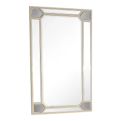 The elegant Templar Mirror features a smooth surface with beveled edges accented by an antiqued mirrored frame. With its curved edges, the mirror adds a style factor to your contemporary or rustic chic decor. This well-crafted mirror blends artistically with both pastel and bold color pallets. Beveled 24 x 36 mirror has a high quality silver backing. Ready to hang either vertically or horizontally with pre-attached hanging mounts. Antiqued mirrored frame adds style and color to the glass. Hangs either vertically or horizontally. Pre-attached D-ring hanging mounts. Beveled glass edges have been cut at an angle to create a framed look and add dimension. This mirror is sure to be the focal point of the room. Overall dimensions: 24 x 36 inches. Surface Shape: Flat. Purposeful Distressing Type: No Distressing. Mirror Height – Top to Bottom: 28.625. Mirror Width – Side to Side: 16.875. Largest Dimension: 35.375. Trend: Casual. Size: Large (3O-in to under 5O-in H). Edge Type: Beveled. Mounting Bracket Included: Yes. Mounting Hardware Included: No. Tilting: No. Shelf Included: No. Wood Species: Pine.