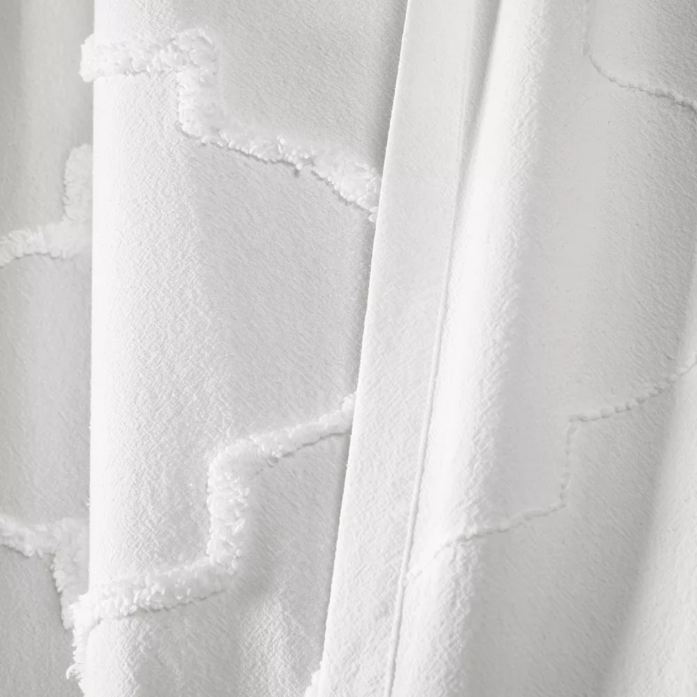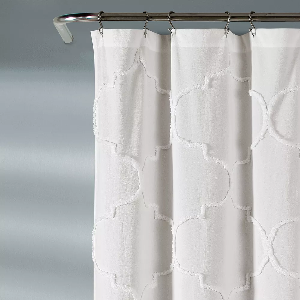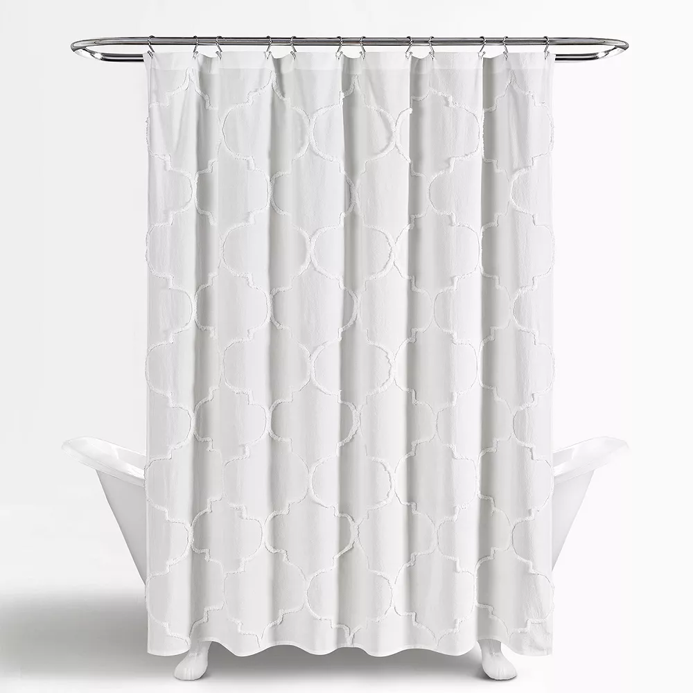 - These stylish new shower curtains add delightful texture to your master bathroom or guest bathroom with chenille woven embellishments on cotton fabric. The classic trellis pattern is eye-catching but will not take over the look of the bathroom.