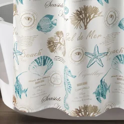 - If you love a coastal look, this shower curtain is for you. Neutral color tones and various types of sea life, including starfish, seahorses, reefs, fish and more come together beautifully. Your master or guest bathroom will feel like an ocean retreat.