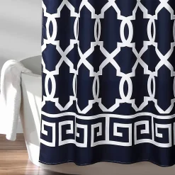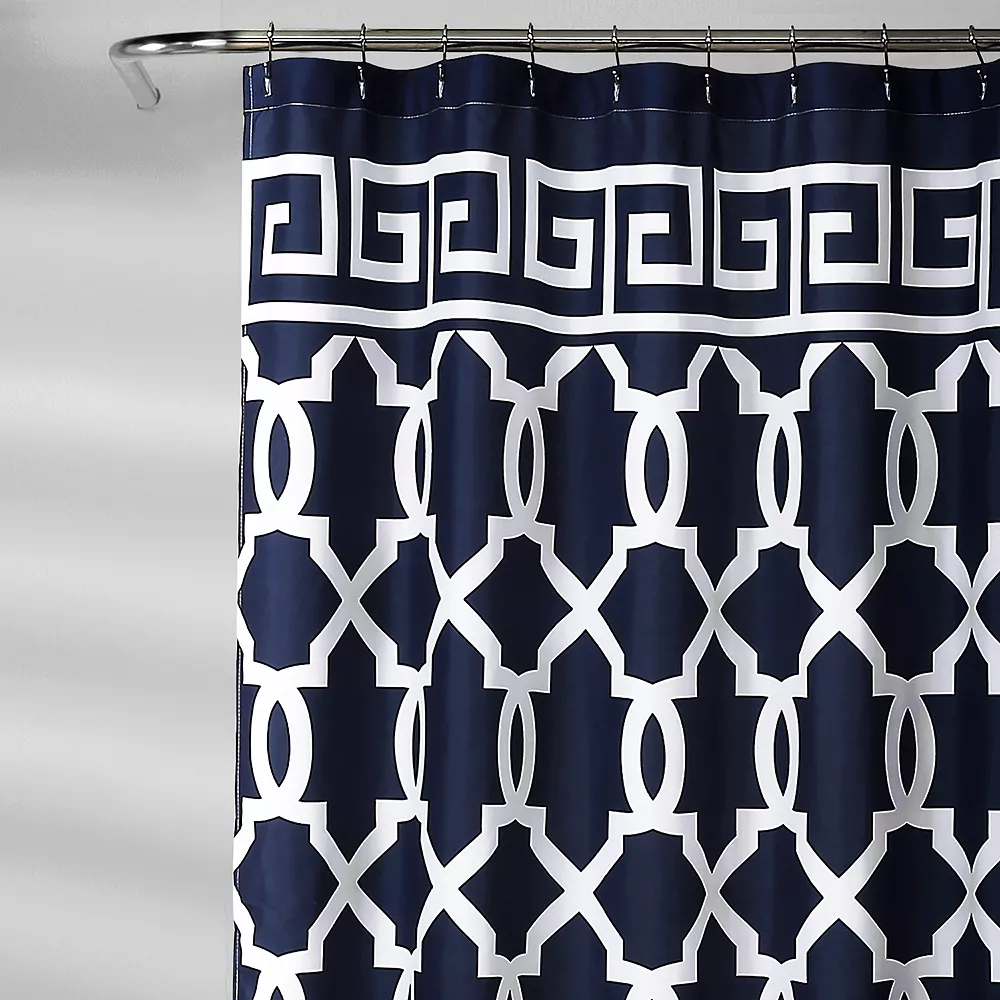 The printed maze design borders both the top and bottom of the shower curtain and a modern trellis pattern runs the length between them.