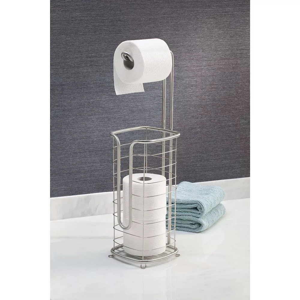 Keep toilet paper rolls handy and stored in style with the Toilet Paper Holder Stand from mDesign. The holder has room to stash three extra rolls. A cutaway front and open top makes it easy to quickly grab a roll. Raised feet on the bottom keep rolls off of the bathroom floor so they always stay clean and dry. Move the holder anywhere you want with the freestanding design.
