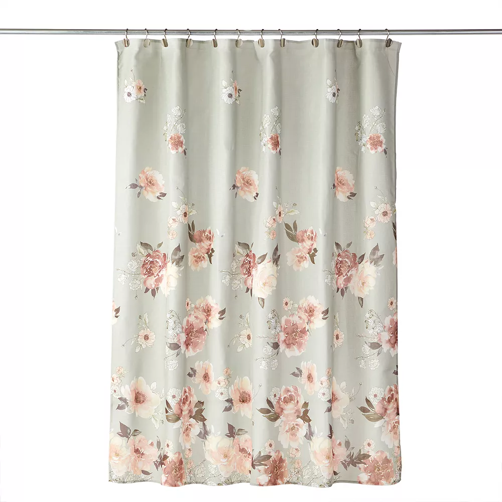 - The lightweight woven shower curtain is featured in a calming sage color with a floral pattern in shades of blush, rose and nude. 12 button holes line the top for easy hanging; use of a liner is recommended (both sold separately).