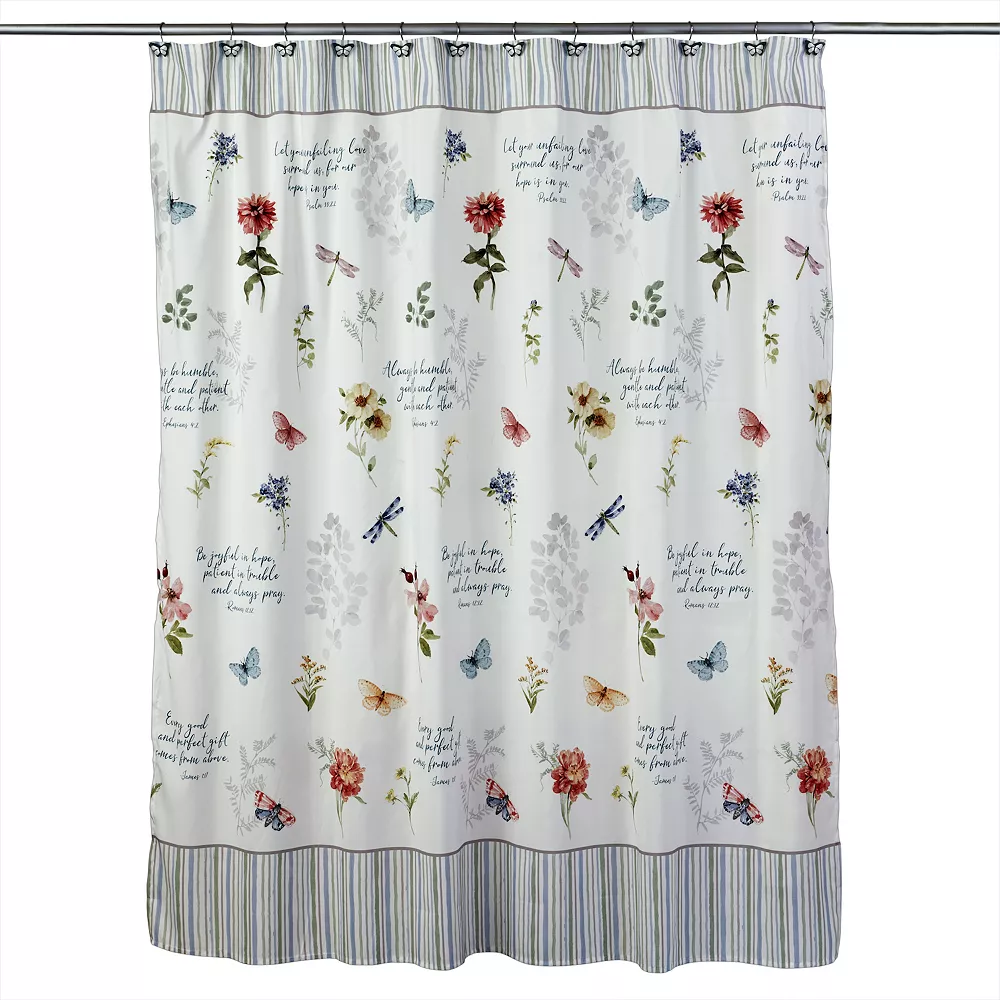 - Add inspiration and beauty to your bath with the Inspirational Meadows collection. This lightweight shower curtain features a pretty floral pattern, biblical verses and striped trim. 12 button-holes line the top for easy hanging. Use of a liner is recommended; liner/hooks sold separately.