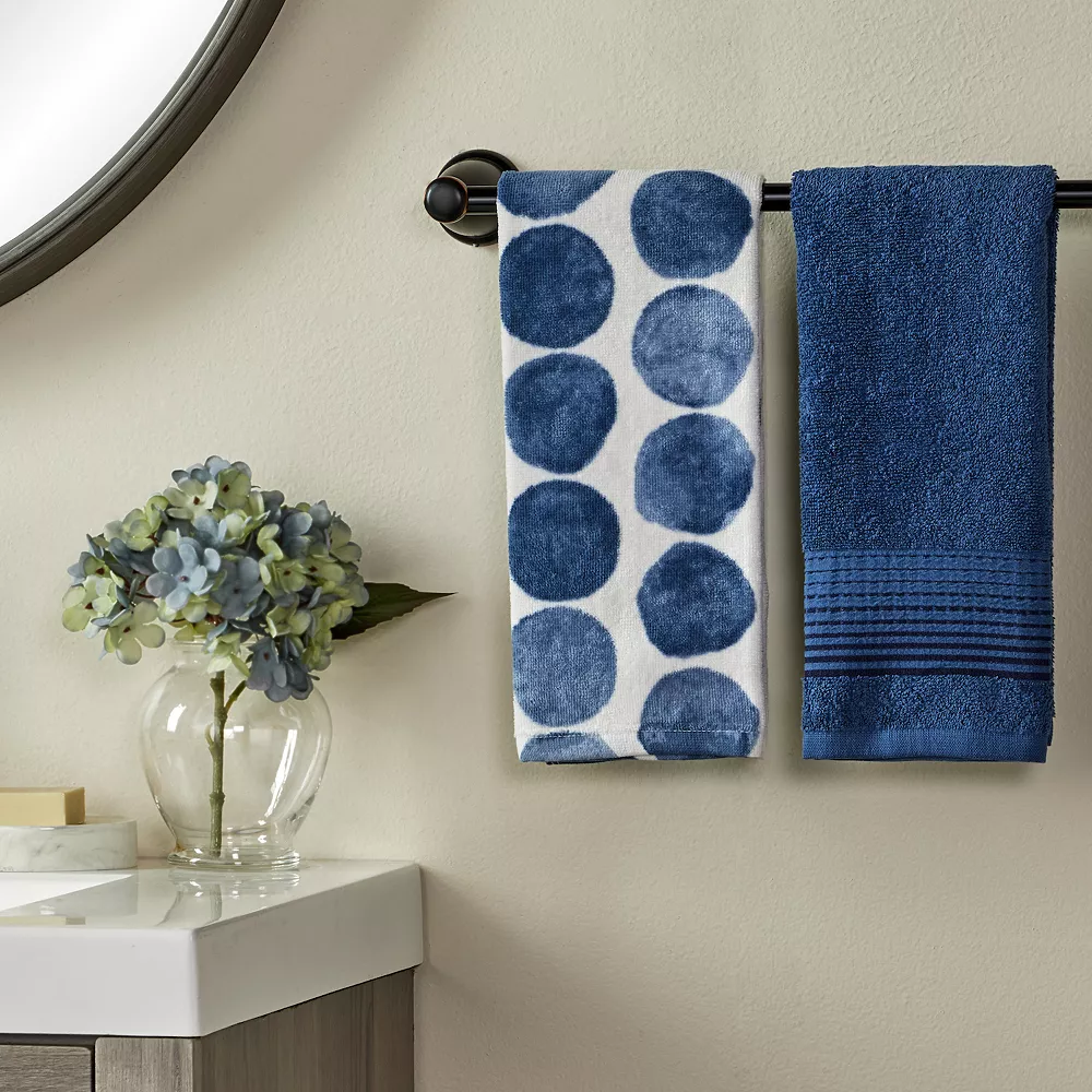 - Spot-on style. Give your bath a fun, fresh update with the Logan Bathroom Collection. Included are two hand towels. One towel is featured in solid terry with a woven weft insert and banded hem. The other towel is featured in soft cotton velour with a blue-tone dotted print.