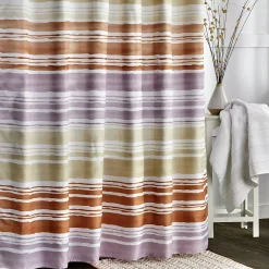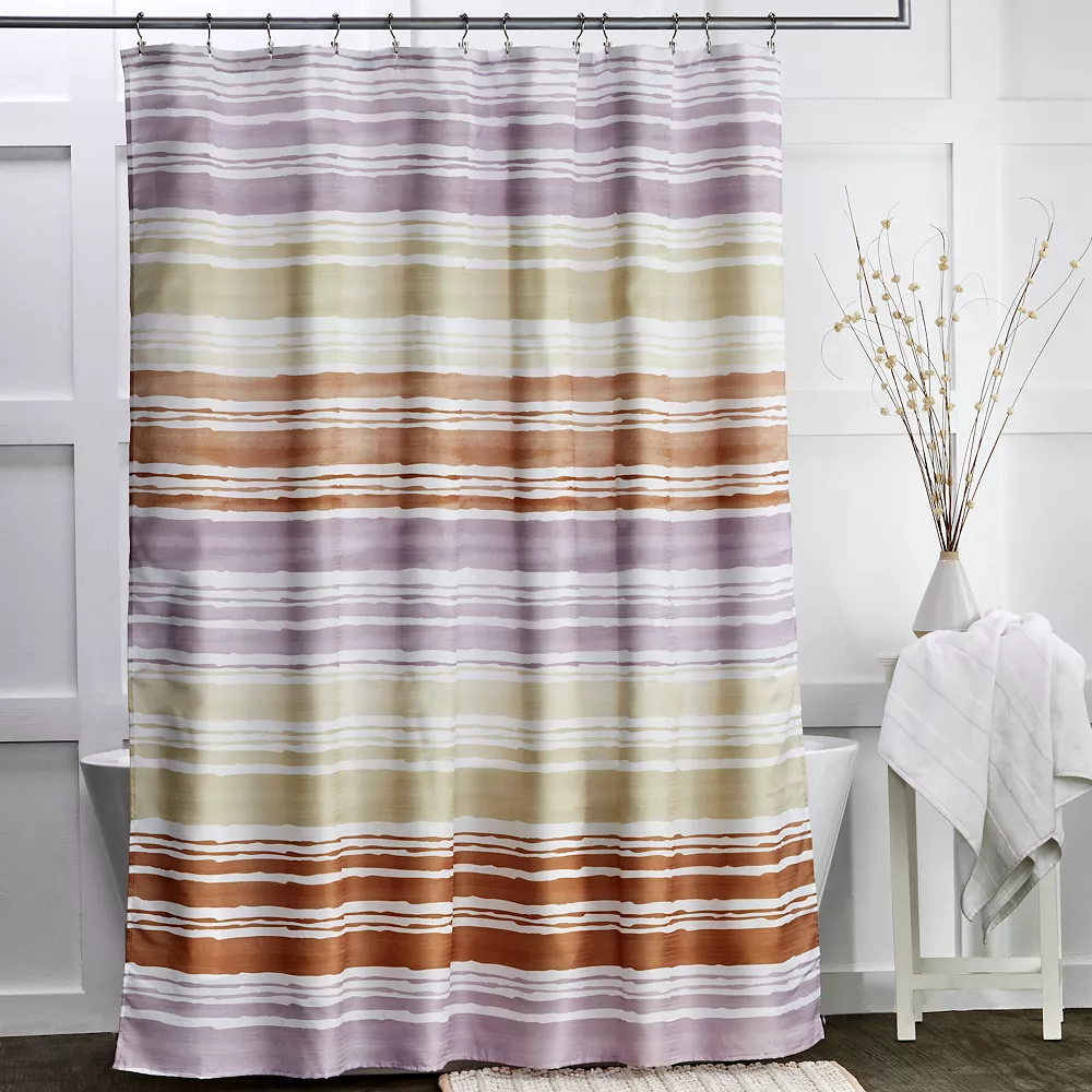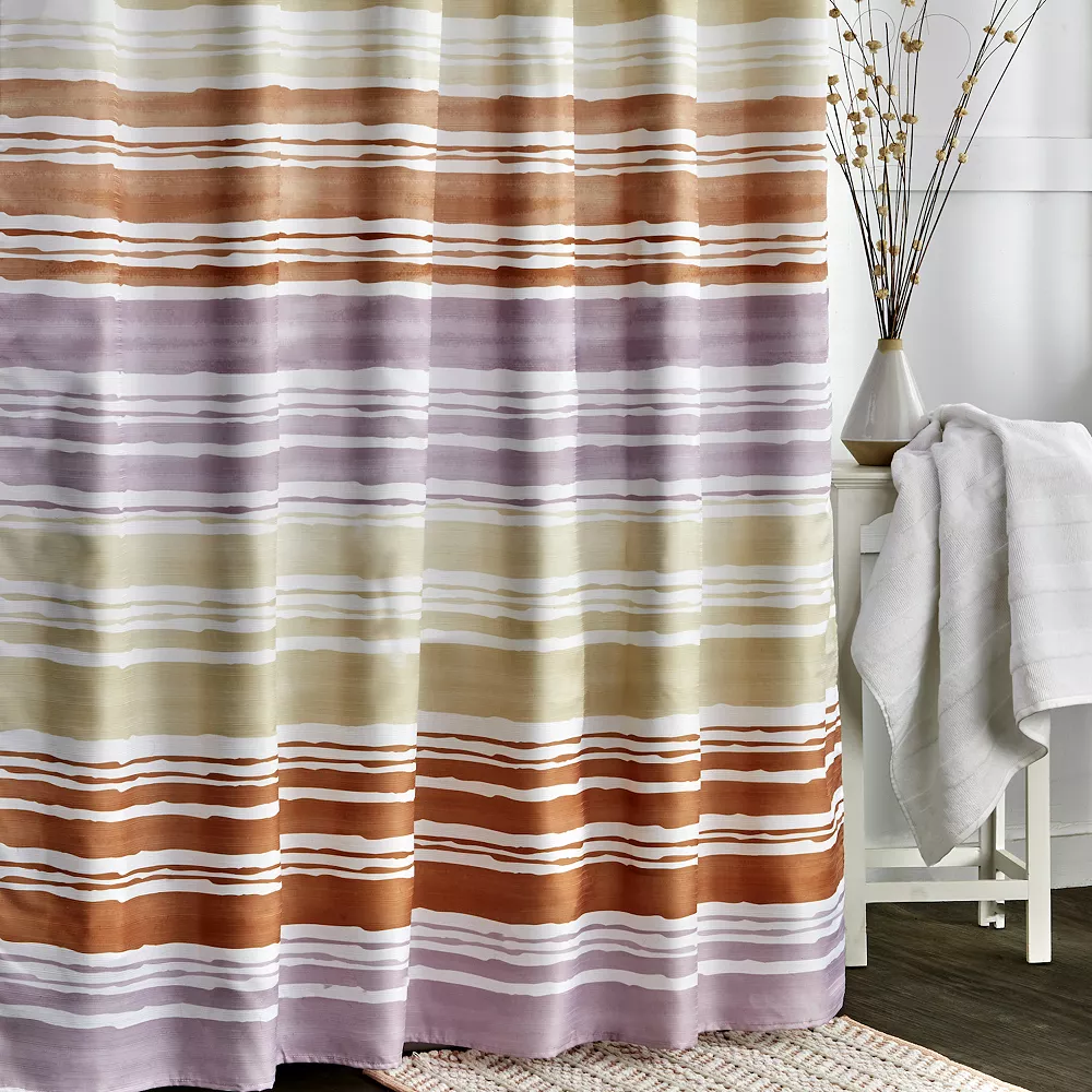 - Add pops of color to brighten up your space with the Tide Wide Stripe shower curtain. This lightweight, machine-washable woven features a colorful striped design in a flowy, watercolor-like finish. 12 button holes line the top for easy hanging. Use of a liner is recommended; liner and hooks not included.