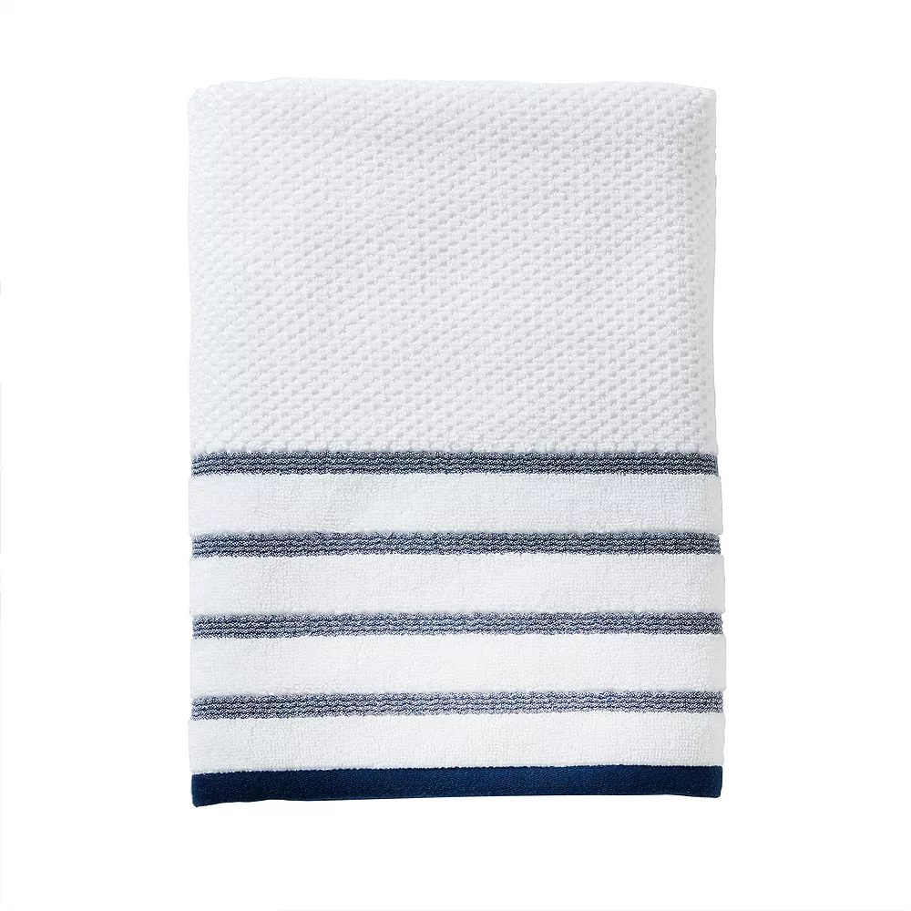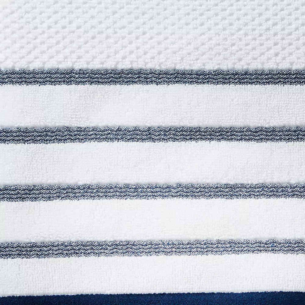 - Soft and absorbent, the bath towel is made of plush terry with pintucked navy stripes.